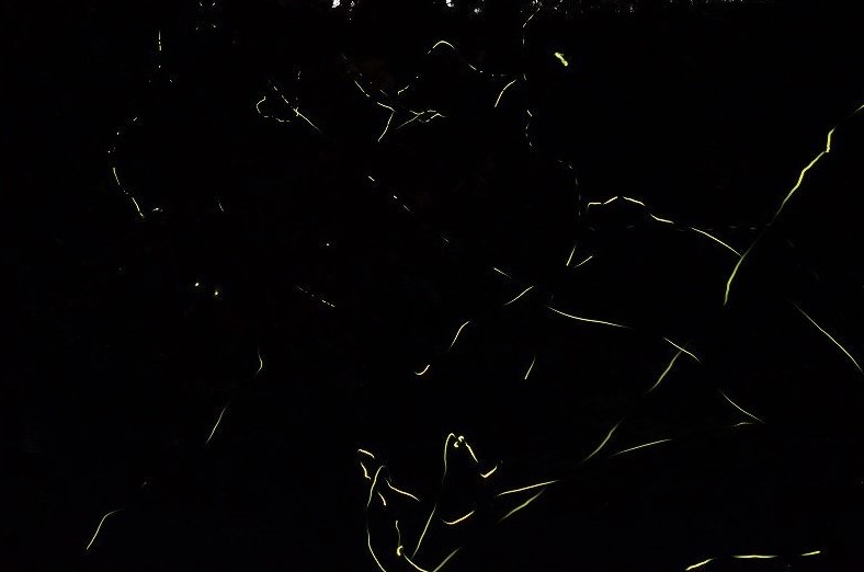 廬山の滝の方にもいるのでしょうが、遊歩道には街路灯がないうえ、夜間はイノシシや鹿が活動しているのでさすがに見に行くことができませんが、男滝の上流には「中山ホタルの里」がありますので、そこから流れてきたホタルがおそらく舞っていると思われます。